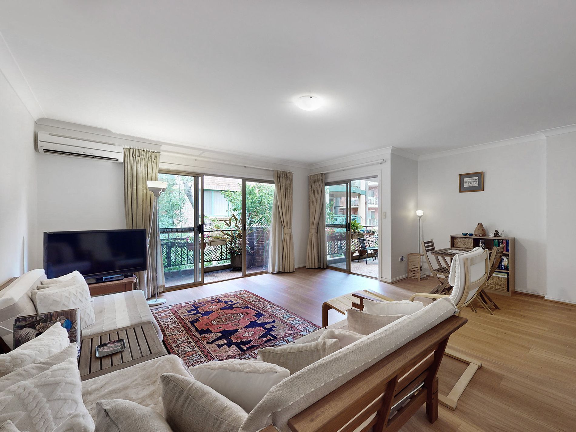 - Spacious combined lounge and dining area with split air-conditioner system with access to two-size balconies