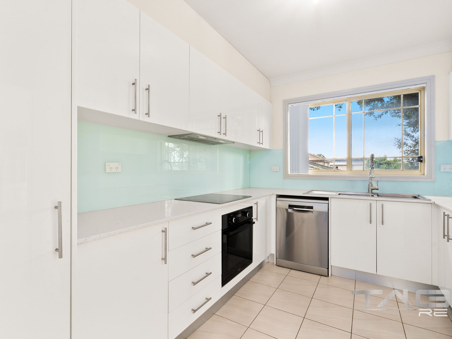 - Modern kitchen with stone benchtops, glass splashback, electric cooktop, oven, and dishwasher