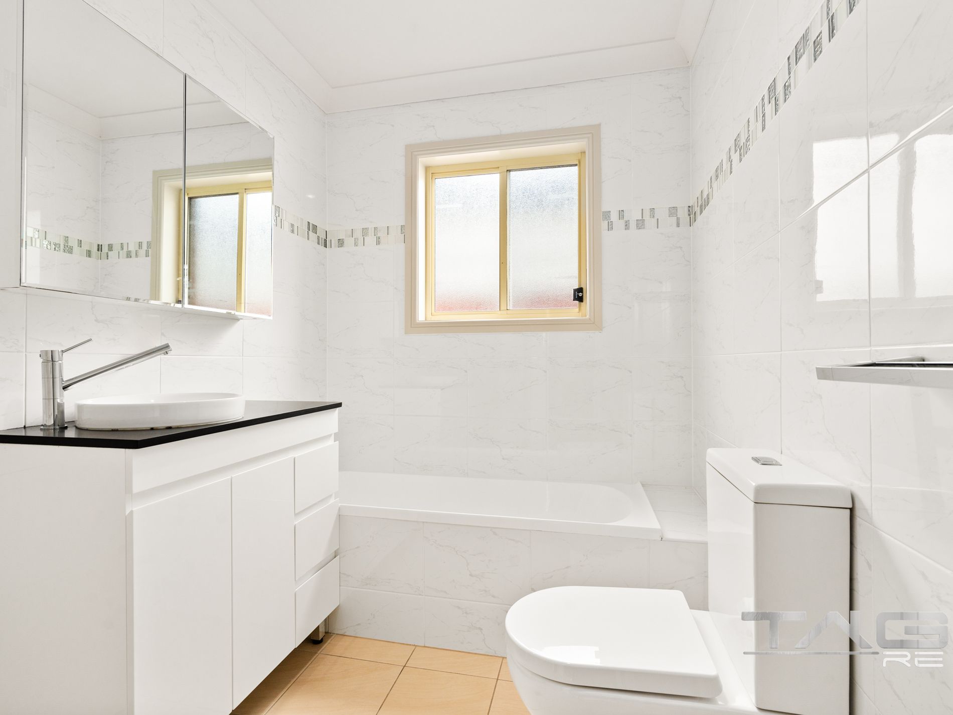- Stylish bathroom featuring floor-to-ceiling tiles and quality finishes